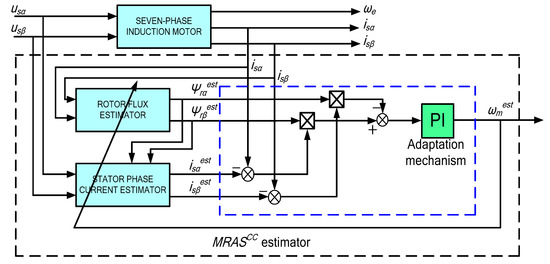 The basic scheme of the MRASCC estimator is presented in Figure 6. The MRASCC estimator consists of two estimators: the rotor flux estimator, and stator phase current estimator. In the MRASCC estimator, the components of the stator current vector of the induction motor are compared with the components of the stator current vector reproduced with using the stator–current model of the stator circuit. The rotor flux estimator (current model) is tuned with the rotor speed signal determined by the adaptation mechanism.