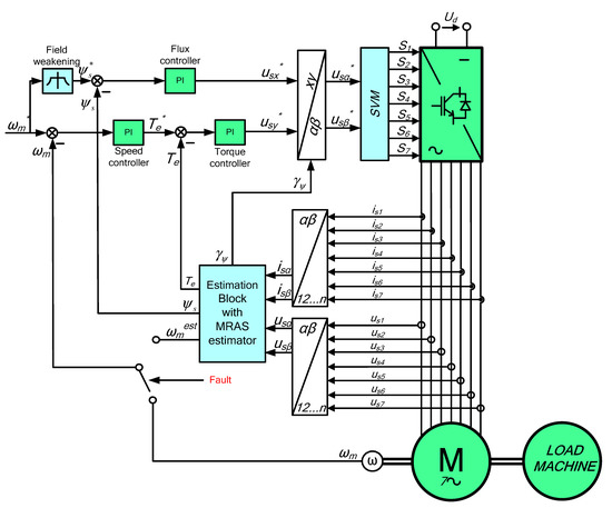 This paper is organized as follows. In Section 2, the modelling and analysis of a seven-phase induction motor is developed. In Section 3, the VSI control with application of the space vector modulation method is analyzed. The control systems based on MRAS estimators are discussed in Section 4. The operation of DTC-SVM control with MRAS estimators is described in Section 5. In Section 6, the performed simulation studies and results have been presented. Section 7 includes the conclusions and discussion about the results of the performed studies.