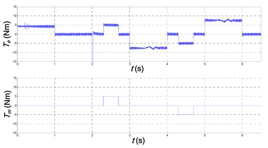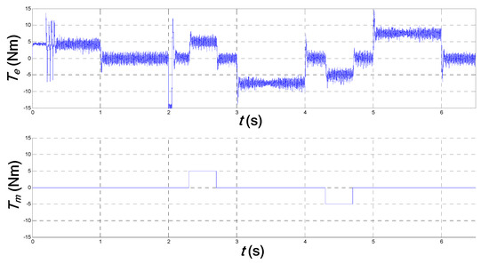where Te is the motor electromagnetic torque; p = d/dt which is the differentiation operator; [us], [is], [ir] are the column matrixes of stator phase voltages, stator phase currents and rotor phase currents, respectively; the indexes s and r denote the variables and parameters of the stator and rotor windings, respectively; [ψs], [ψr] are the column matrixes of the stator winding coupled fluxes and the rotor windings coupled fluxes, respectively; [Rs], [Rr] are the diagonal matrixes of the stator and rotor winding phase resistances, respectively; [Lss], [Lrr] are the stator and rotor inductance matrixes, respectively; [Lsr] is the matrix of mutual inductances between the stator and rotor windings; and pb is the number of the pole pairs of the motor; φe is the electric angle of the rotor rotation. The number of elements in the column matrixes of all electromagnetic values is equal to number of considered motor phases (n = 7).
