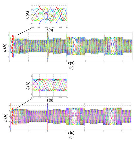 Figure 14 shows the trajectories of the components of the stator phase currents of the seven-phase squirrel-cage induction motor for DTC-SVM control system with both MRAS estimators.