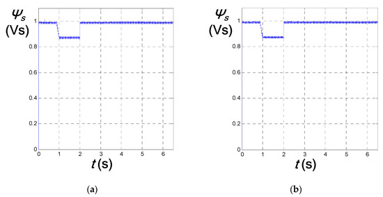 The waveforms of the reference and estimated magnitude of the rotor flux vector of the seven-phase induction motor for the DTC-SVM control system with MRAS estimators are shown in Figure 13. The rotor flux vector is controlled properly with maintenance of the nominal value during setting of the nominal angular speed. When the set motor speed increases above the nominal value, the magnitude of the stator flux vector decreases in proportion to the increase in the motor speed. There are no significant differences in the magnitudes of the rotor flux vector trajectories in the DTC-SVM control system with both MRAS estimators.