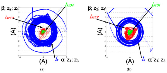 The presented hodographs have been determined for the values of the currents measured during the entire operating period of the drive system. It can be stated that the components of the stator current vector in the z-axes reached smaller values in comparison with the values of the components of the stator current vector in the α–β-axes. In the DTC-SVM control system with MRASCC estimator, smaller instantaneous oscillations in the trajectories of the components of the stator phase currents could be noticed.