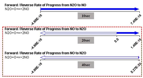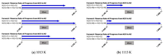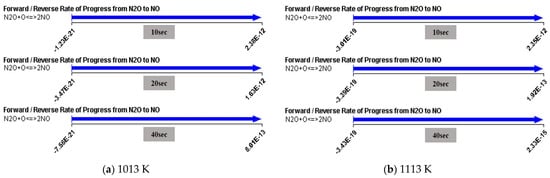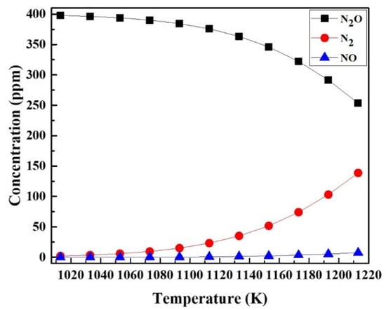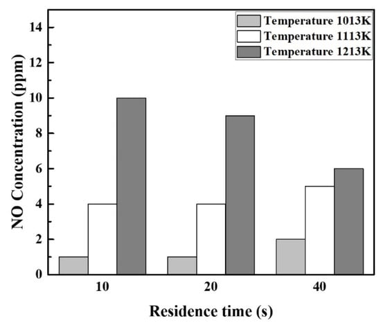 - The NO concentration increased with residence time at temperatures of 1013 K and 1113 K, but decreased with the time at 1213 K. This resulted from the inverse reaction rate associated with the conversion of NO back to N2O. Therefore, the optimal operating conditions for the highest reduction efficiency must be studied.