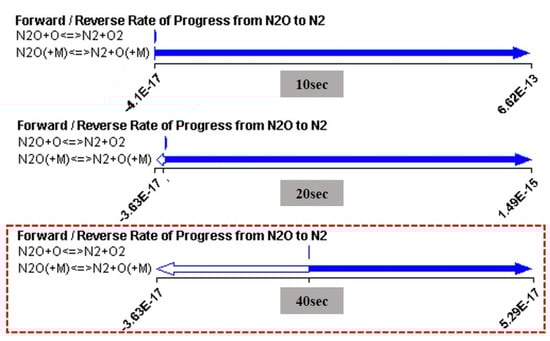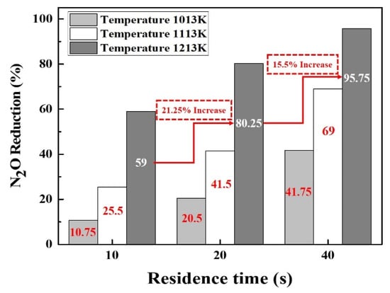 - The change in the N2O reduction rate at temperatures of 1013 and 1113 K increased with the residence time, but decreased at 1213 K and a time of 40 s. This resulted from the inverse reaction rate and the regeneration of N2O at 1213 K. Therefore, exaggerated residence times and thermal decomposition temperatures are inefficient in terms of the energy consumption compared to the reduction of N2O.