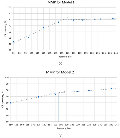 Minimum miscibility pressure for (a) Model 1 and (b) Model 2.
