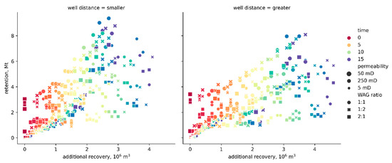 Additional recovery and retention were opposed parameters, i.e., maximum retention does not always bring maximum additional recovery (Figure 4). In the first years of CO2-EOR, retention to additional recovery ratio was higher, and with time, this ratio decreased.