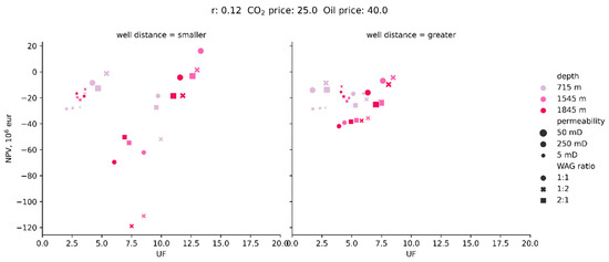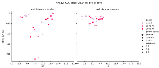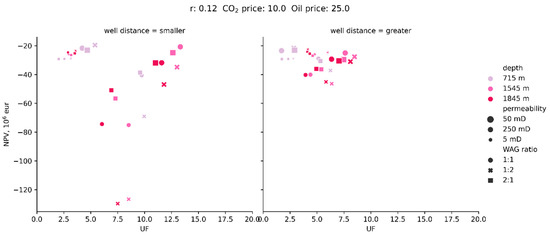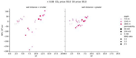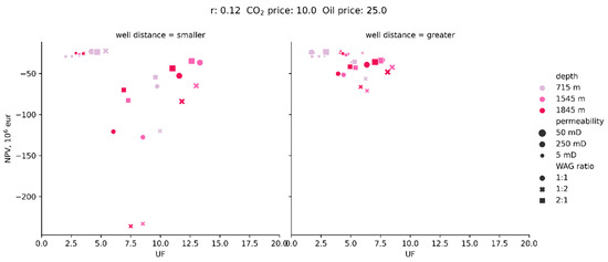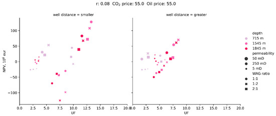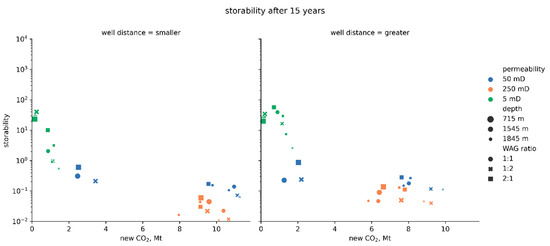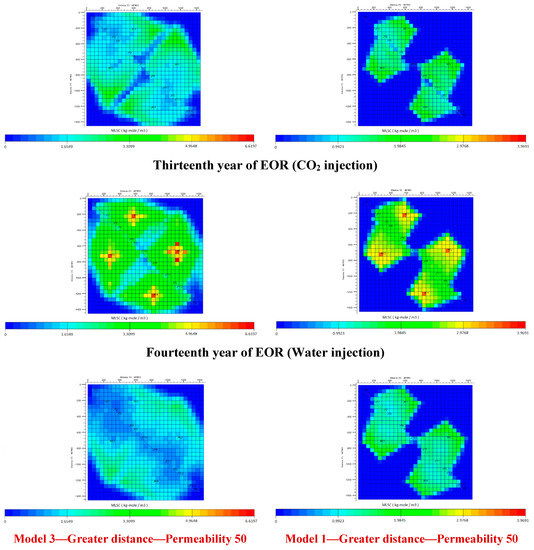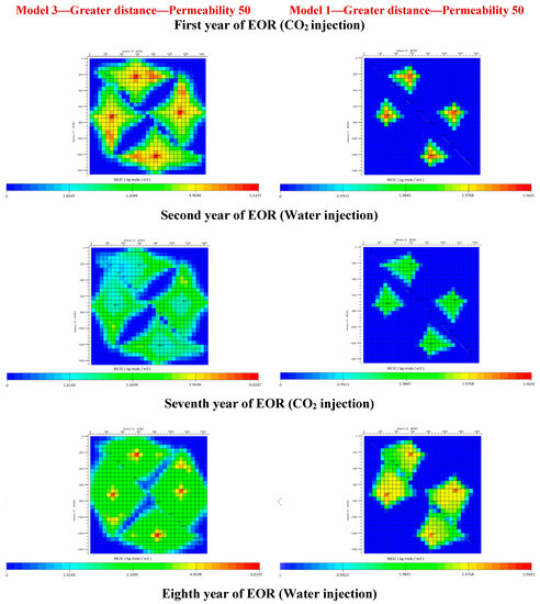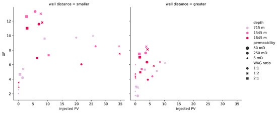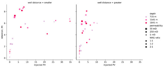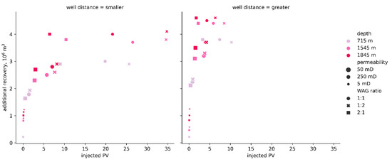 The results show that if additional recovery was observed in relation to the injected pore volumes (PVs) of CO2 after 15 years of CO2-EOR, it was obvious that more PV could be injected in cases with a smaller distance between production and injection wells, which finally, allows more CO2 to be retained in a reservoir (Figure 5).
