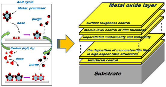 The ALD process starts by injecting the metal precursor and oxidant pulse alternatively into the reaction chamber, as shown in Figure 2. Metal precursors and oxidant are adsorbed by surface chemical reactions on the substrate. This is followed by the purge steps which are inserted after the precursor and the oxidant pulse by injecting the inert gas, such as N2 or Ar. ALD technique has been rapidly adopted in microelectronic device processes to deposit a wide variety of thin-film materials such as oxides, nitrides, and metals [18].