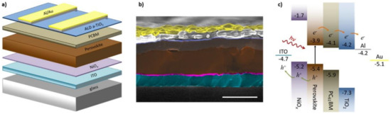 (a) Device architecture and (b) false color SEM image of the inverted perovskite photovoltaic device (scale bar 500 nm). (c) Idealized energy level diagram of the corresponding device architecture. Reproduced with permission from Reference [20].