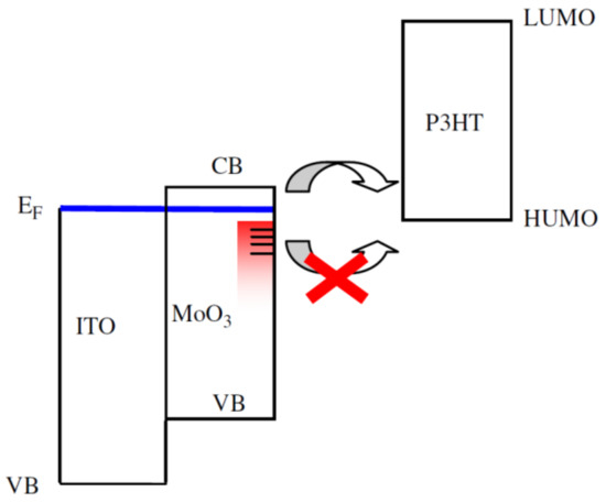 Schematics of charge extraction path ways at the anode buffer (MoO3) and P3HT interface. Reproduced with permission from Reference [21].