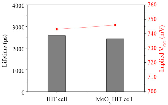 Change of effective carrier lifetime and implied VOC before and after MoOX application to HIT cell. Reproduced with permission from Reference [45].