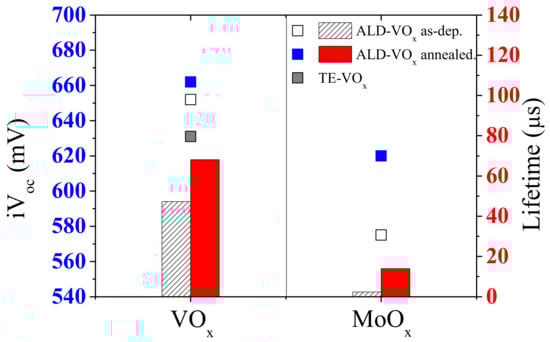 The comparison of lifetime and implied VOC for as-dep and annealed ALD-VOX and thermal evaporated VOX. Reproduced with permission from Reference [53].