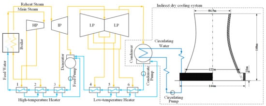 The thermal–fluid process of the investigated 660 MW supercritical thermal power plant with indirect dry cooling system is shown in Figure 1. The feed water is converted into superheated steam by the boiler, and then the steam expands in the turbine to output mechanical power which drives the alternator to generate electrical energy. At the same time, some of the steam passing through the turbine is bled at a series of openings to heat the feed water in heaters. The exhausted steam out of the turbine is cooled by the indirect dry cooling system and condensed into water which goes back to the boiler. The main operating parameters of the investigated power plant under design condition are listed in Table 1.