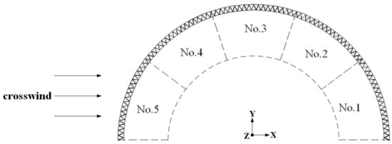 For easy distribution of the circulating cooling water, the air-cooled heat exchangers are divided into several sectors in practical engineering. In this study, for the investigated half of the air-cooled heat exchangers, there are five sectors, as shown in Figure 4. In Sectors 1, 3 and 5, there are 36 cooling columns, while in Sectors 2 and 4, there are 34 cooling columns. In one sector, circulating cooling water is evenly distributed among cooling columns.