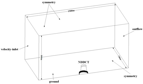 On the other hand, a 3D numerical model of NDDCT is used to calculate the performance of NDDCT under various ambient conditions. In the numerical model, the governing equations with boundary conditions are discretized with the second-order upwind differencing method. Pressure and velocity solutions are coupled by the SIMPLE algorithm. The computational domain and boundary conditions are shown in Figure 5. With a width of 1500 m and height of 800 m of the computational domain, a fully developed flow can be ensured. The detailed mesh can be seen in our previous study [34,35].
