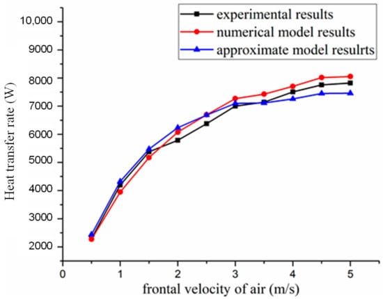 In order to validate the approximate model, both the numerical model and the approximate model are used to calculate the heat transfer rates of a sample of the air-cooled heat exchanger in the investigated NDDCT with different frontal velocity of air. Experimental wind-tunnel tests are chosen as references [42], since airflow generated by a wind tunnel is almost uniform. Comparative results are shown in Figure 6. The average deviation and standard deviation of the numerical model are 3.802% and 3.98%, respectively, while they are 3.691% and 4.1% for the approximate model. Considering the air velocity distribution of a heat exchange column, usually with a maximum of 3.5 m/s, it could be concluded that both the two models are accurate and reliable.