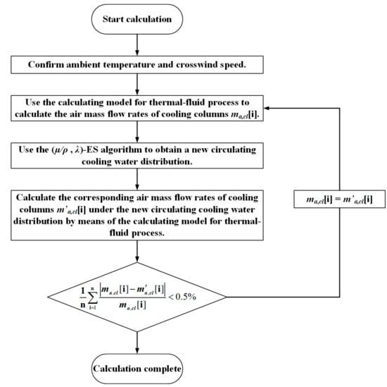 The purpose of the calculation is to obtain the optimal circulating cooling water distribution under certain ambient temperatures and crosswind speeds, thus, at the beginning, the values of the temperature and speed is confirmed. By means of the calculating model for thermal–fluid process, the air mass flow rates of cooling columns can be calculated. Then, utilizing the (μ/ρ, λ)-ES algorithm, a new circulating cooling water distribution is obtained. With this new circulating cooling water distribution, the corresponding air mass flow rates of cooling columns can be calculated by the calculating model for the thermal–fluid process. If the average relative error between and is less than 0.5%, it is considered that the change in air mass flow rate is negligible, and the new circulating cooling water distribution calculated by the (μ/ρ, λ)-ES algorithm is optimum.