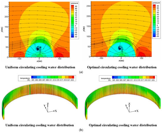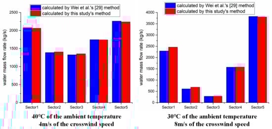 Figure 8 shows the optimal circulating cooling water distribution calculated by the aforementioned method and the method in Wei et al.’s research [29]. Obviously, the water distribution calculated by the method in this study and that calculated by the method in Wei et al.’s study [29] are almost the same. The average deviation and standard deviation of the optimal distribution are 1.04% and 1.38% under 40 °C of ambient temperature and 4 m s−1 of crosswind speed, while they are 3.691% and 4.1% for the approximate model under 40 °C of ambient temperature, 4 m s−1 of crosswind speed and 30 °C of ambient temperature, 8 m s−1 of crosswind speed. It could be concluded that the calculating method for the optimal circulating cooling water distribution proposed in this study is credible.