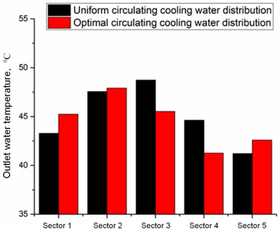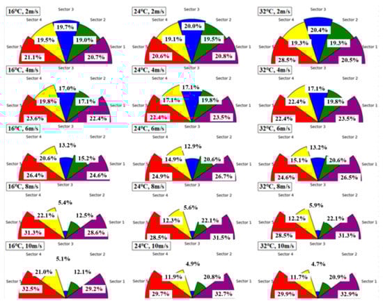 By means of the calculating method introduced in Section 2, the optimal circulating cooling water distributions under different ambient conditions are obtained, the results are shown in Figure 9. Colored areas represent the ratio of mass flow rate pumped into each sector and the total mass flow rate. It could be seen that the windward sector, Sector 5, has the most circulating cooling water and the leeward sector, Sector 1, takes second place; the lateral sector, Sector 3, always has the lowest distribution of circulating cooling water. That is consistent with the airside mass flow rate distribution. The difference in water mass flow rate among sectors becomes bigger with the increase in crosswind speed. However, on the other hand, ambient temperature almost has no effect on the circulating cooling water distribution.