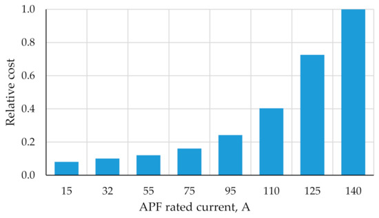 Bar graph of exemplary relative costs of active power filters (APFs) depending on their rated current.