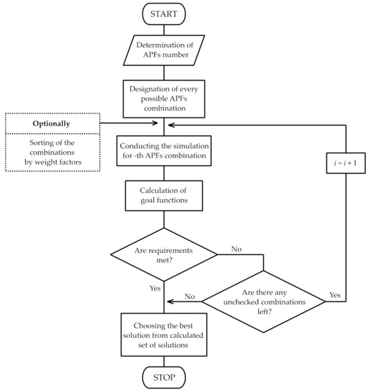 The problem of APF sizing and allocation has been solved using a brute force (BF) algorithm, which due to computation times is especially useful in the case of small-scale problems. In this paper, the BF algorithm allows us to find all solutions, including the global minimum, and evaluate the quality of solutions obtained by the decision tree (DT) algorithm. The block diagram of the BF algorithm has been presented in Figure 2.