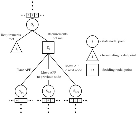 An implemented decision tree algorithm works iteratively by checking which step should be taken next in order to reduce the current value of the minimized goal function. The APF combination through which the algorithm passes is coded in a vector representing the state of each APF (1).