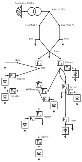 Diagram of the test power system with marked possible locations of APFs (F1–F14).