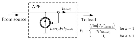 It should be noted that despite the series connection of APFs (F1–F14) in the test power system, the APF itself is constructed as parallel, based on a current-controlled current source (Figure 5). The nonlinear loads in the presented system are six pulse rectifiers, which are the cause of current and voltage waveform distortions in the entire circuit. The modeling and simulation software based on the iterative method in the frequency domain described in [46] was used for calculations. In this case, a simple, without losses, ideal model of the active power filter was used in the simulations (Figure 5).