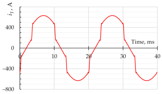 As can be seen in Table 1, the THDV and THDI values are significant and can potentially cause power losses and power quality problems in the analyzed system. Distortion is also visible in the transformer current and voltage waveforms, which have been shown in Figure 6 and Figure 7, respectively. The voltage waveform shows instantaneous voltage drops, which increase the THD coefficient. These drops are due to the high steepness of the transformer output current. The oscillations around these drops result directly from the used model of nonlinear receivers and the simulation method in the frequency domain. The presented waveforms are a combination of a finite number of harmonics obtained as a result of simulations and not measured waveforms.