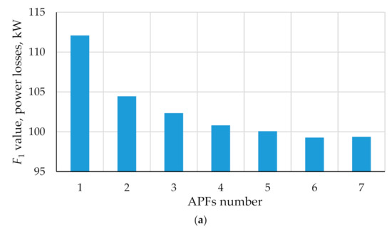 Table 2 contains the APF connection cases, which were selected by the software as the best in terms of minimizing each of the considered goal functions with the limitation related to the maximum THDV coefficient. From these data, it can be seen that the best solutions for a small number of APFs are in most cases the solutions for a larger number of APFs.