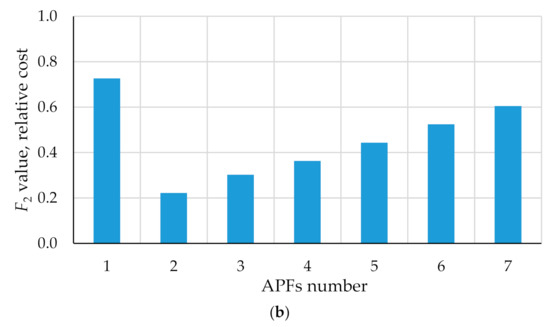 The impact of placing subsequent APFs on the values achieved by the individual goal functions in the cases selected as optimal was also analyzed. The results were presented for the group with the limitation resulting from the maximum allowable THDV level. The results of this analysis have been shown in Figure 9. For the goal function F1, the increase in the number of APFs results in a clear decrease in power losses, which is natural and results directly from the concept of an APF, i.e., harmonic reduction and reactive power compensation. In the case of the goal function F2, the relative value (related to the maximum APF cost) was used. With the assumption of limiting the THDV factor, the minimum costs for the case with two APFs is visible. Reaching the required maximum THDV in the system is, therefore, the most cost effective when using two APFs. Any other solution is more expensive.