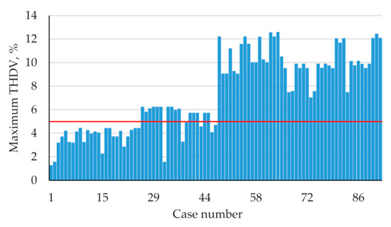 All the results obtained by applying the brute force algorithm, even before the analysis in terms of finding the minimum for the individual goal functions, are in the form of a set of values of these functions associated with each possible solution. For a larger number of APFs, the number of cases is so large that the graphical representation becomes unclear, therefore an example bar graph of the maximum THDV value in the system for selecting the position of only two APFs has been presented below (Figure 10). This graph shows how large the variability of the maximum THDV is for the analyzed cases.