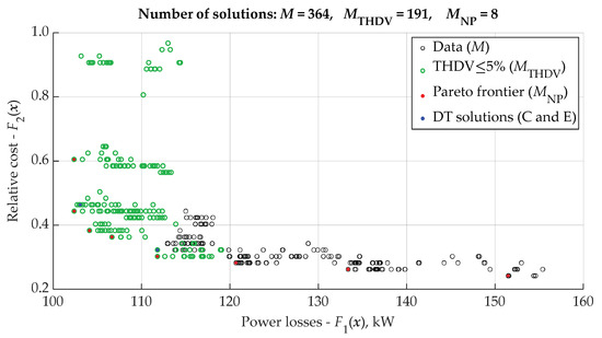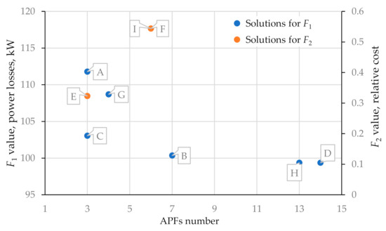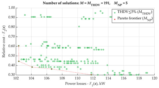 In order to illustrate the results from a wider perspective, for the case of three APFs in the system, all feasible solutions have been presented in Figure 11. As can be read, for 191 solutions out of 364 (see Figure 8) the constraint on the THDV coefficient (less or equal 5%) is fulfilled. Moreover, the Pareto frontier includes five solutions for which the objective functions given by (2) and (3) take approximately the values between 102 and 112 kW for F1 and between 0.30 and 0.60 for F2. These solutions are optimal in the Pareto sense and the choice of the one to be implemented depends on other aspects, e.g., easier APF allocation in some nodes or long-term financial analysis. Therefore, selection of the optimum solution can vary among decision-makers because it is based on their preferences and criteria.