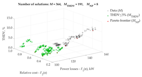 All solutions for three APFs presented in Figure 12 allow us to have a deeper insight into this example. The Pareto frontier in such a case consists of eight points representing the optimum solutions for the unconstrained problem. The feasible points presented in Figure 11, for which THDV ≤ 5%, have been also marked out in Figure 12. The same data have been presented in 3D space in Figure 13.