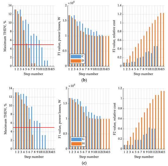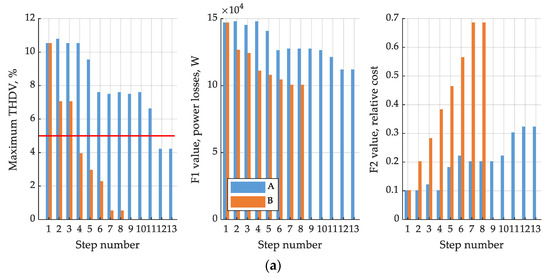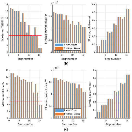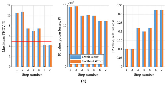 Figure 14 and Figure 15 present THDV, F1, and F2 values for each step of the decision tree algorithm. Results were grouped in such a way that each axis contains a representation of routes differing from each other only by presence of the Wcorr coefficient. Figure 14 shows routes for F1 minimization and Figure 15 for F2 minimization. In the case of F1, every solution shows a clear tendency of reducing power losses in the system for each step taken. This effect is connected with placing additional APFs or with moving APFs to better positions. The requirement of reducing the THDV coefficient below 5% level enforces placing more than one APF, which consequently raises the cost of the solution. It is worth stressing that the THDV limitation requirement also causes the algorithm to increase the cost of the solution by placing another APF even during F2 minimization. The reduction of costs can only be achieved and is visible in cases when the THDV requirements are met.