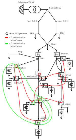 From the set of all examined routes, two examples were chosen in order to provide a more detailed analysis of the decision tree algorithm workflow. The chosen C and E routes are the best compromise between the number of APFs and the goal function values. Each step and the decision made by the algorithm for those routes have been presented in Table 4. Additionally, all steps taken by the decision tree have been also superimposed graphically on the power system schematic in Figure 17. Both ways of presenting the data provide a clear view on the capabilities of the decision tree algorithm implementation. Although C and E routes result in placing three APFs, they vary by APF sorting method and final results. The different sorting also causes E route to turn around at some point in order to examine a previously checked position but with the first APF already placed. Such behavior was not necessary in C route. Those examples represent different strategies that can be applied by the algorithm during the optimization process.