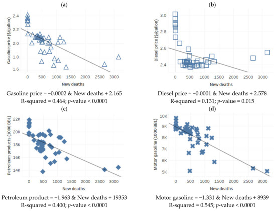 Relationships between new COVID-19 deaths and energy sectors. Note: (a) Gasoline price, (b) diesel price, (c) petroleum products supplied, and (d) motor gasoline supplied. In the four charts, the x-axis indicates new deaths due to COVID-19 and the y-axis represents (a) weekly regular conventional retail gasoline prices (dollars per gallon), (b) weekly diesel retail prices (dollars per gallon), (c) weekly petroleum products supplied (thousand barrels), and (d) weekly finished motor gasoline (thousand barrels) over the period of 45 weeks from 27 January 2020 to 30 November 2020. Petroleum products include finished motor gasoline, kerosene-type jet fuel, distillate fuel oil, residual fuel oil, propane/propylene, and other oils.