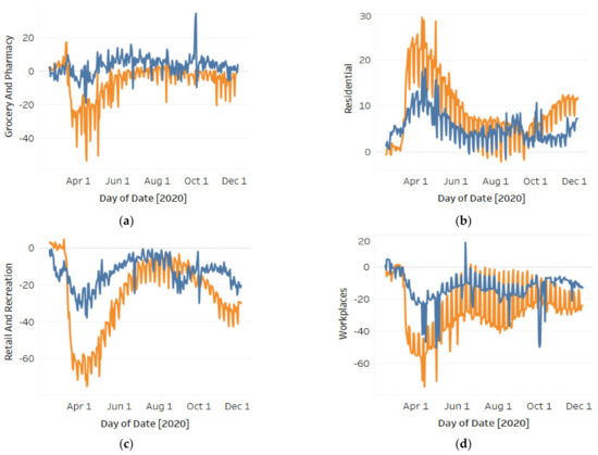 As shown in Figure 4, COVID-19-based mobility change of underperforming nations (in orange) tends to be more volatile than that of outperforming ones (in blue) is, except for the beginning of October when the COVID-19 second wave started, at four different locations: Grocery and pharmacy, residential, retail and recreation, and workplaces. It is also supported by the higher standard deviation (SD) of underperforming nations (see Table 8 for efficiency and Table 9 for index). According to Pearson correlation, it is found that outperforming and underperforming nations show relatively similar patterns at residential and transit stations, positively related with mobility measures and a public health insurance system can play a significant role in changing mobility measures.