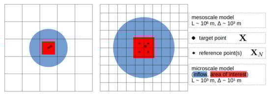 Two examples of setups of downscaling of meso-scale data with a micro-scale model: the size of the domain of the micro-scale model is given in blue (inflow domain with smoothed topography) and red (region of interest) colors, the grid below exemplary illustrates the grid of the meso-scale model. In the setup on the left-hand side, the small micro-scale model domain is within one grid cell of the meso-scale model and therefore only one reference point can be used. With larger computational power, the domain of the micro-scale simulation can be increased and the meso-scale model resolution can become finer (right). Therefore, to use several reference points becomes possible.