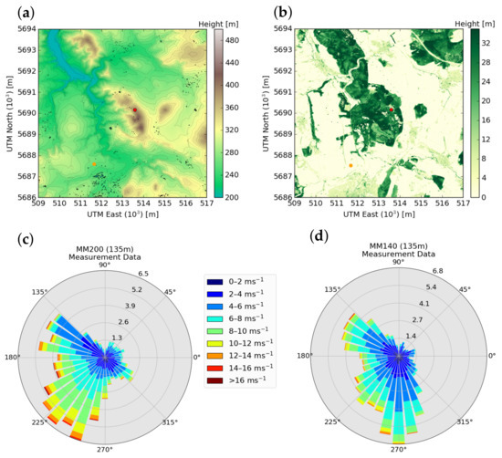 Terrain height (a) and forest heights (b) of the Rödeser Berg site close to Kassel in central Germany. The red dot marks the position of the met mast at the hill top (MM200), the orange dot the second met mast (MM140). (c,d) show the respective wind roses during the measurement period. (Terrain and forest height data source (ALS data): Hessische Verwaltung für Bodenmanagement und Geoinformation).