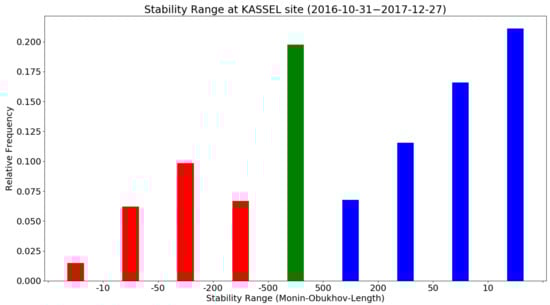 As described in [9] a precursor run was used to generate profiles that are consistent with the Monin-Obukhov theory. Those profiles are afterwards used as inflow conditions for the cylindrical domain and the flow vector is projected according to the desired wind direction for the 3D simulations. A constant inflow wind speed of about 8 ms at 80 m height was chosen, an according analytic profile used for a 1D precursor run and resulting profile used as inflow for 3-dimensional simulations with a binning of degree in wind direction. To address the impact of atmospheric stratification on the flow across the Rödeser Berg three different classes of atmospheric stratification are defined. The binning of this classes is for stable stratification and for unstable, values outside () are considered neutral. Within these bins the stratification is considered uniform. The micro-scale model is simulated for Obukhov lengths of L = 200 m (stable), L = −200 m (unstable/convective) and L = ∞ (neutral). These particular values are chosen as representative stratification for a chosen stratification range. This is a conservative approach, which may not be an optimal solution, but it minimizes additional errors, if the stratified simulations would represent a stronger stratification. The binning is in line with typical definitions in wind energy research (e.g., [49,50]). This combination of stratifications and wind directions leads to a set of 108 simulations used to generate the full micro-scale database. For the classification, we also investigate the distribution of the atmospheric stratification at the site based on the analysis of the Obukhov length from the NEWA dataset extracted at the site. In terms of nine different stability bins this is given in Figure 4. The colors denote the representation of the distribution in the three classes used in this study (red-unstable, green-neutral, blue-stable). Stratification measurements were also available on site (not shown). To keep the case close to the real world industrial wind energy siting application where these data are hardly available, we used the meso-scale model data only.