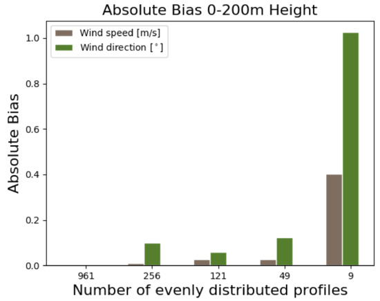 Different characteristic profiles in comparison: Average profiles of N evenly distributed profiles were extracted from the micro-scale simulations, and an absolute Bias was calculated, for both wind speed and wind direction (average between 0 and 200 m, 5 m steps), compared to 961 profiles (3 km by 3 km with profiles every 100 m).