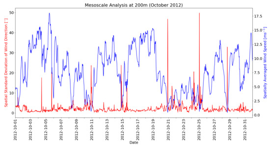 For this purpose, a grid of three by three grid cells around the Rödeser Berg site was extracted from NEWA, for which the innermost four cells overlap with the size of the micro-scale domain. Over these nine grid cells, the spatial standard deviation of the wind direction as well as the spatially averaged wind speed from the same grid cells are calculated for a full wind climate in 2012. October 2012 is plotted in Figure 6. This time window includes a situation with both a strong change in wind direction together with a high wind speed on 5 October 2012 at 1800 UTC (see Figure 6).