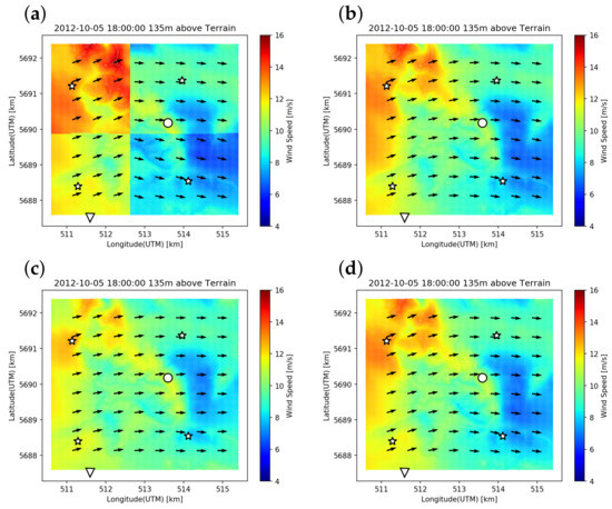 where is the final downscaled wind field based on several meso-scale reference points, is the downscaled wind field based on a single point Equation (1) and is an interpolation scheme, e.g., for the inverse distance weighting (e.g., [29]):