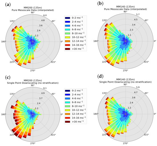 As the site provides parallel measurements from two tall met masts, we can correct the downscaled data based on the linear regression from one mast and evaluate the improvement at the other one. Thus, we apply the data correction as described in Section 2.5. Figure 9b shows the data of Figure 9a at MM200 after the correction with the linear regression based on mast MM140. In both scatter plots we can see different statistical values (for details check Section 2.6. The , or coefficient of determination, describes the spread of our scatter cloud which is not changed by the correction. BIAS and, as well as the root mean square error (RMSE) are reduced significantly by the correction. When comparing the resulting corrected and downscaled wind roses (Figure 10a,b) with the downscaled non-corrected (Figure 8c,d) and measured (Figure 2c,d) ones, the improvement is standing out. Except for the southerly wind sector, the wind roses of MM140 already agree to a large extent. At MM200 the overall wind direction distribution matches to a good extent. Only the winds from the southwest show a larger disagreement. An underestimation is present.