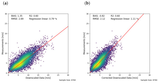 Scatter plots between measurements and downscaled data: (a) MM200 downscaled data, and (b) MM200 corrected (based on regression at MM140; exemplary for single point downscaling).