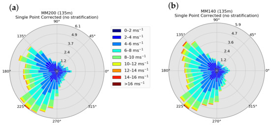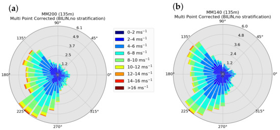 Corrected wind roses from single point downscaling at MM200 (a) and MM140 (b).