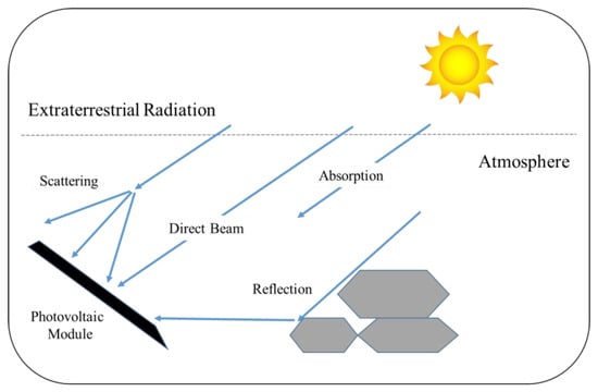 Having a reliable forecast of solar irradiance (SIr) is of great importance, due to its effect on the design of photovoltaic systems and measuring solar energy production [,]. Figure 1 shows solar radiation on a photovoltaic module installed on the Earth. Up to now, scholars have suggested various methods (e.g., empirical [] and remote sensing [] approaches) for analyzing the SE parameter. However, recent advances in soft computing have led to the utilization of diverse machine learning tools for this purpose. These modes have gained a lot of attention for renewable energy analysis like feature selection [].