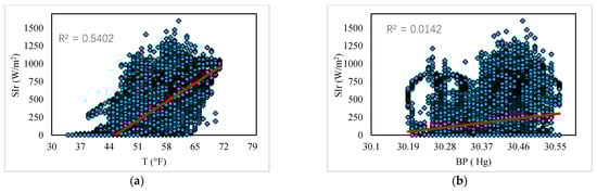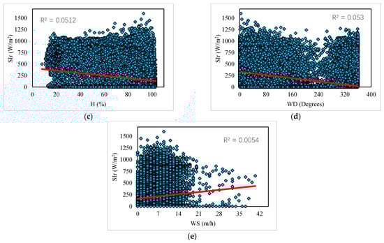 Considering the R2 values calculated in Figure 3 (0.5402, 0.0142, 0.0512, 0.053, and 0.0054 for the T, BP, H, WD and WS, respectively), it can be said that the most meaningful relationship (among these five inputs) is obtained for the T. In a general view, the values of SIr tend to increase with the increase in this factor. A detailed statistical description of the used dataset is presented in Table 1. As is seen, the SIr values range over [1.1, 1601.3] W/m2, while this extent is [34.0, 71.0] °F, [30.2, 30.6] Hg, [8.0, 103.0] %, [0.1, 360.0] degrees, and [0.0, 40.5] m/h for the T, BP, H, WD, and WS, respectively.