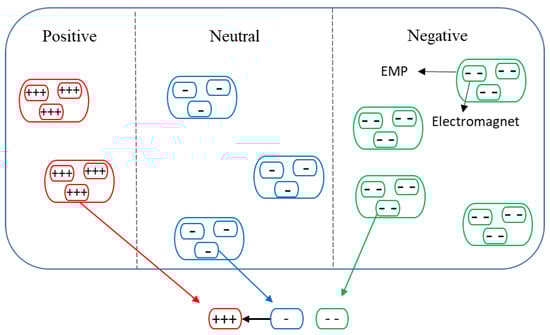 Abedinpourshotorban, et al. [] developed a physics-based optimization strategy and named it electromagnetic field optimization. Many scholars have benefited from this method for a wide range of problems [,]. It is a population-based technique in which each individual is represented by an electromagnetic particle (EMP). The EMPs are distinguished by different polarities. The attraction–repulsion rule is used to improve the solution by changing the position of the EMPs.